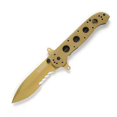 5.38″ closed. 3.88″ desert tan TiNi coated Veff serrated 8Cr14MoV stainless spear point blade. Tan G10 handle. Pocket clip. Extended tang. Thumb stud. AutoLAWKS safety. Boxed.