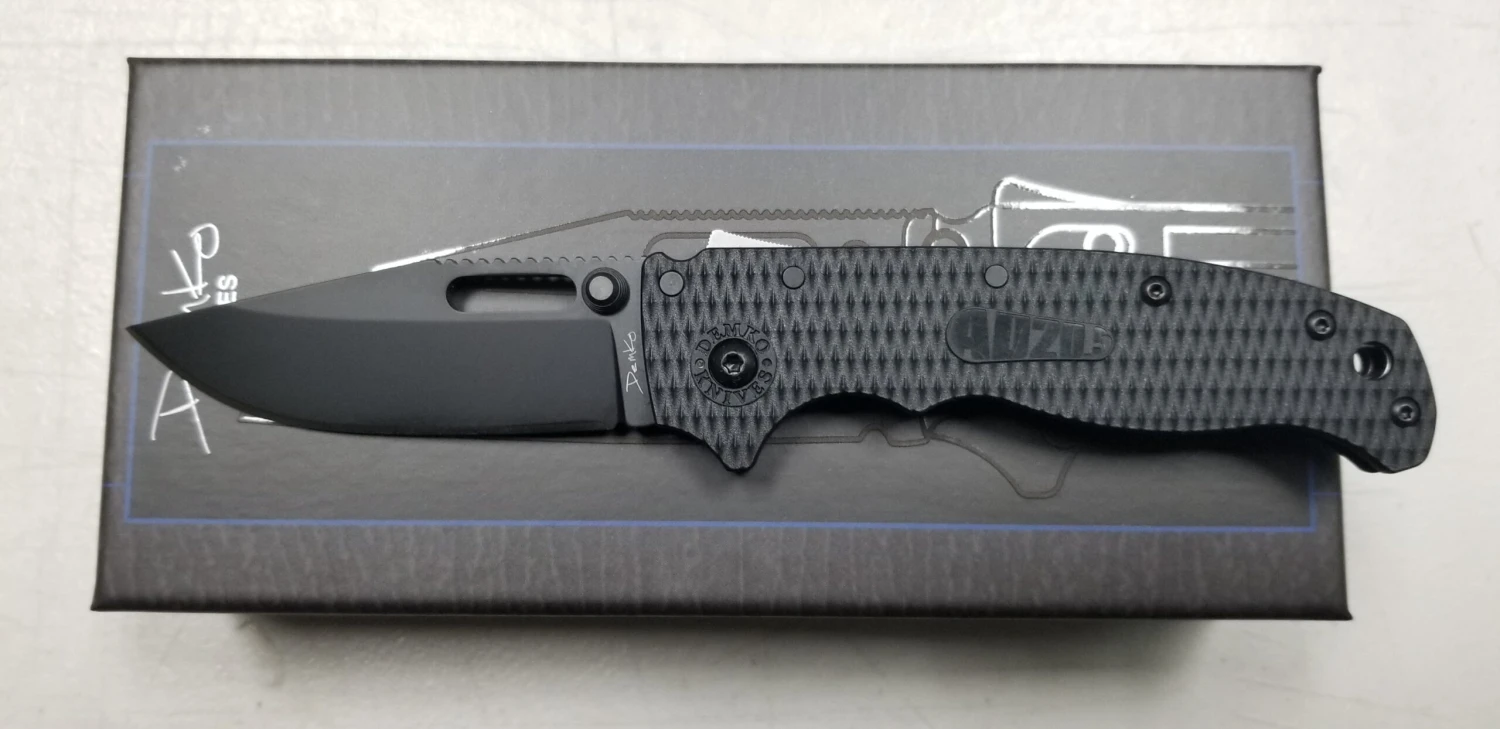 The Shark-Lock⢠mechanism is situated on the spine of the knife and operated with a ramp-like āfin.ā Opening the blade makes the spring-driven lock arm move up and then into a notch in the tang, situating it beneath a lock pin. This range of movement is noteworthy. Itās unique in that the locking mechanism moves forward and back while also moving up and down. This allows for a greater sized blade tang, making a better mechanical advantage in a specific area. And because the drive spring that moves the locking element up into the locked position is contained within the locking arm itself, it wonāt be subject to dirt and grime. The Shark-Lock⢠is very comparable to most Tri-Ad locks for its size and weight. The AD-20.5 has been tested to 875-inch pounds of torque, this is a very impressive number for a 3.5 oz. knife.