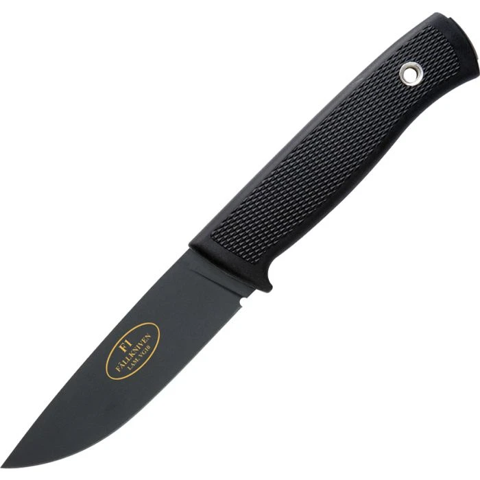 8.25″ (20.96cm) overall. 3.75″ (9.53cm) black CeraCoat 8H coated laminate VG-10 stainless drop point blade. Black checkered Thermorun handle. Full tang. Lanyard hole. Carried by the Swedish National Defense. Black leather belt sheath.