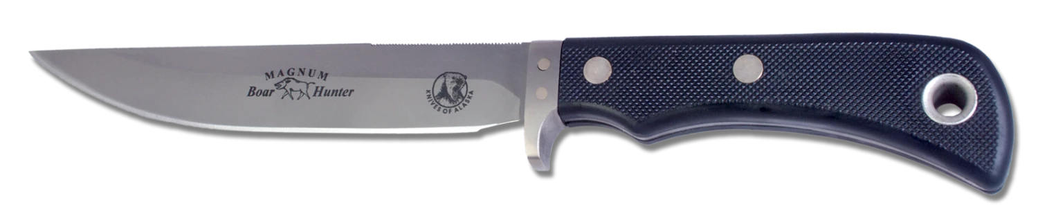 Designed as a final dispatch/bleeding knife for wild boar and other big-game. Blade is straight spined with an ultra-sharp point for deep penetration. The blade finish is a ceramic peened hunters Non-glare. Comes with a vegetable tanned, oiled split-grained cowhide sheath.