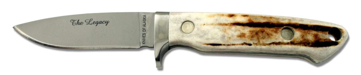 Inspired by one of the greatest knife makers of all time, Bob Loveless, “The Legacy” is Knives of Alaska’s brand new addition to our fixed blade lineup. Beginning with the razor sharp D2 high carbon steel blade, sporting a full tapered tang combined with a beautiful stag handle, this knife has it all—looks, performance, and pride of ownership. The stainless steel finger guard insures safe operation and fits snugly into The Legacy’s high quality genuine American leather sheath. This is the perfect blade for the serious outdoor enthusiast.