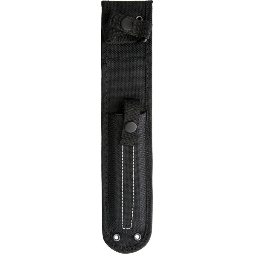 Ontario Air Force Survival. 10 5/8″ overall. 5 1/2″ black epoxy coated 1095 carbon steel sawback blade with blood groove. Black grooved Kraton handle. Lanyard hole. Black Nylon belt sheath.