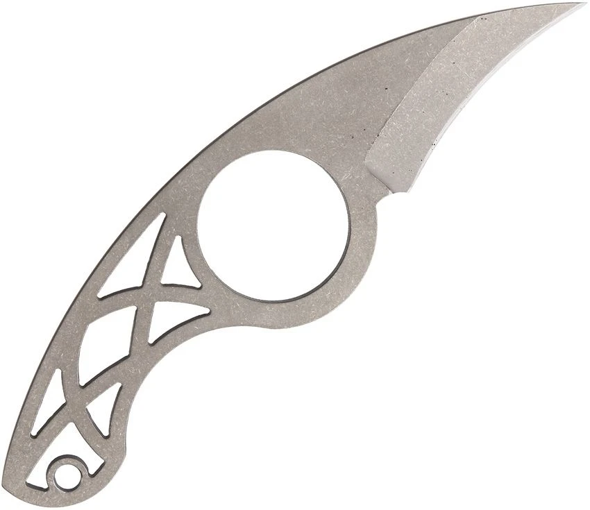 ST La Griffe. 5 1/2″ overall. 2″ chisel ground blade is reinforced with Tungsten to provide strength and durability. One piece stonewash finish 0.125 6Al-4V titanium construction. Skeletonized handle with integrated 1″ diameter finger ring. Lanyard hole. Holstex sheath. Weight: 1.3 oz. (including sheath).