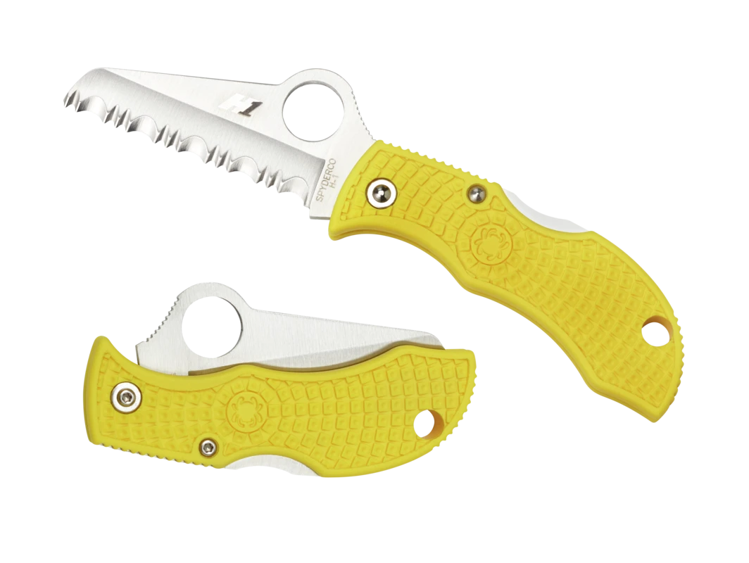 The blunt-tipped sheepfoot blade of this knife is crafted from H-1® steeI, an advanced nitrogen-based alloy that is completely immune to corrosion. Its fully serrated SpyderEdge™ offers extreme cutting power for its size—especially on fibrous materials like rope and netting. The blade’s Trademark Round Hole™ unmistakably identifies it as a Spyderco product and allows easy, fingernail-free opening.