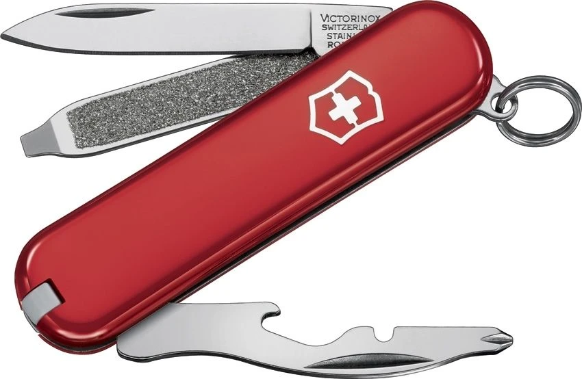 2 1/4″ closed. Red handles. Features knife blade, nail file with screwdriver tip, cap lifter with wire stripper and Phillips screwdriver tip, toothpick, tweezers and keyring.