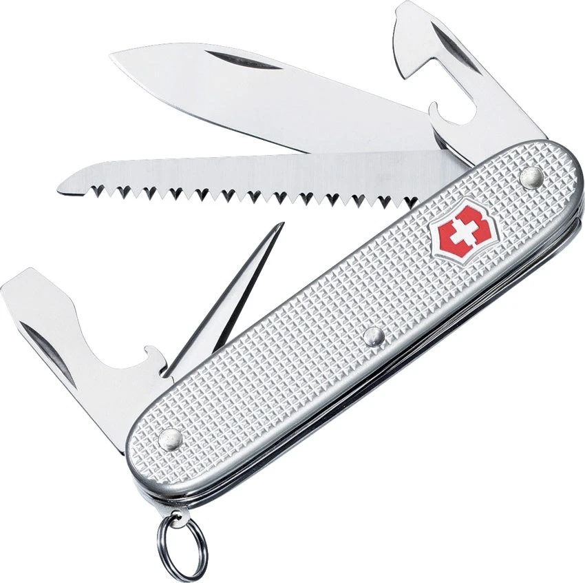 Victorinox Farmer. 3 5/8 ” closed. Silver Alox handles. Features large blade, wood saw, reamer, can opener with screwdriver tip, bottle opener with screwdriver tip and wire stripper, and keyring.