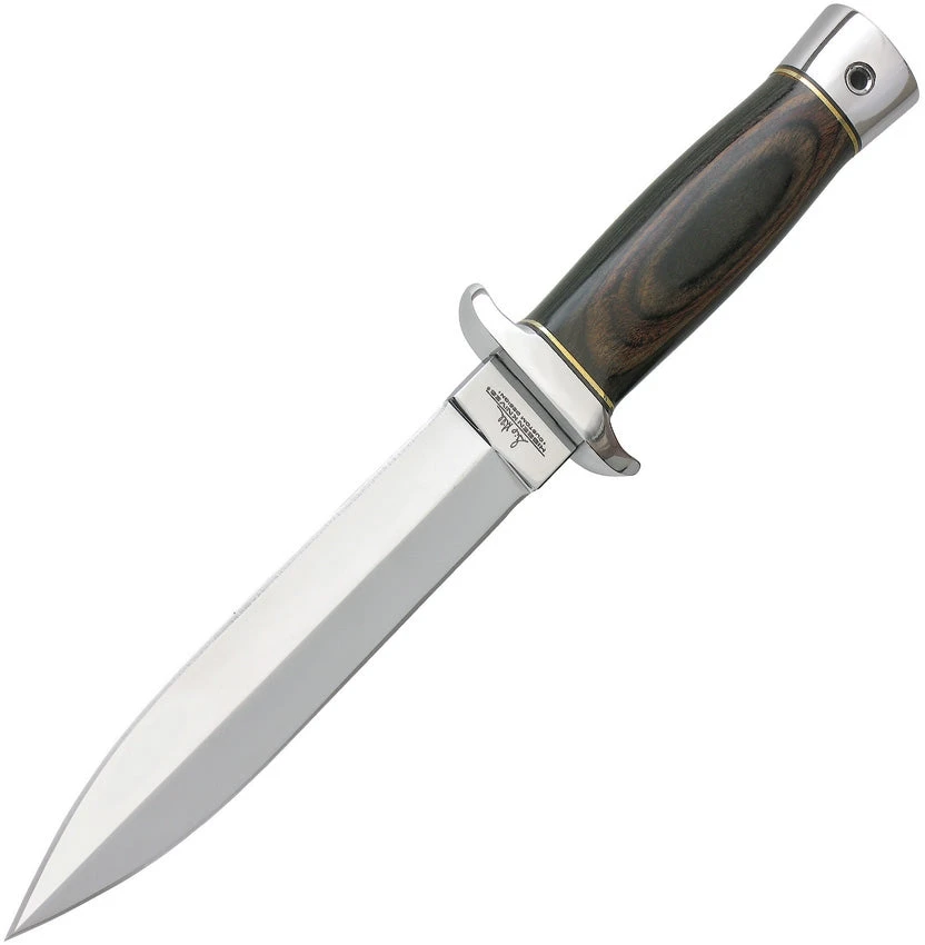 10.38″ overall. 6″ mirror finish double edge 5Cr15MoV stainless blade. Black pakkawood handle. Stainless guard and pommel. Lanyard hole. Black leather belt sheath. Boxed.