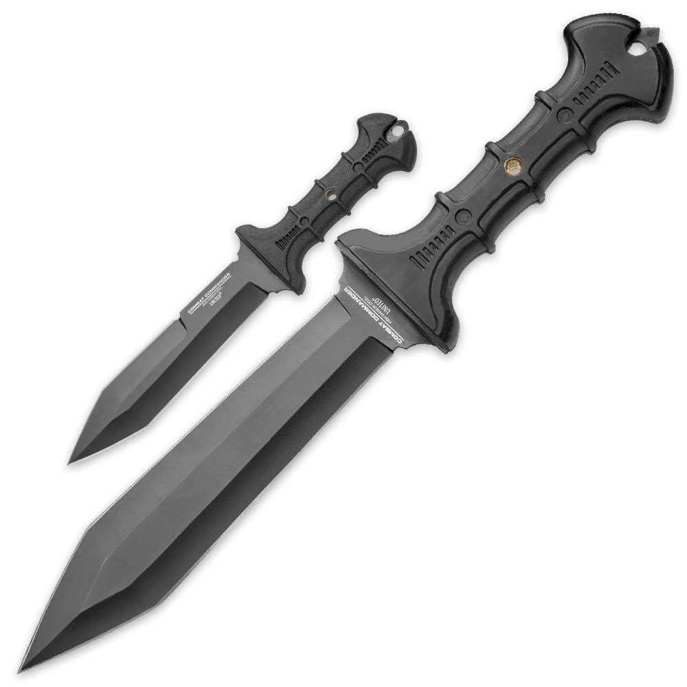Combat Commander has done it again with this incredible Gladius Dagger Combo set! The sharp dagger blades are forged from 1065 carbon steel and have a hard black coating. The handles are injection molded nylon that is fiber filled and as tough as they get. Each features a brass pin and a lanyard hole. A sturdy nylon belt sheath lets you carry the set with ease. They are 12 1/4” and 7 1/4” in overall length.